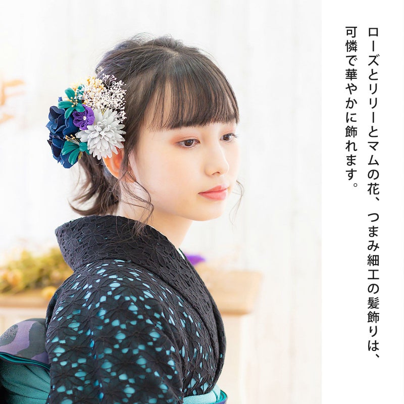 (卒業式応援75%SALE 2/19迄)髪飾り 成人式 花髪飾り コーム Uピン 2点セット 「ローズとリリー ナイトブルー No.55029」 振袖用髪飾り お花髪飾り つまみ細工 成人式 卒業式 結婚式 着物 日本製 【メール便不可】<H>ss2512wkk10