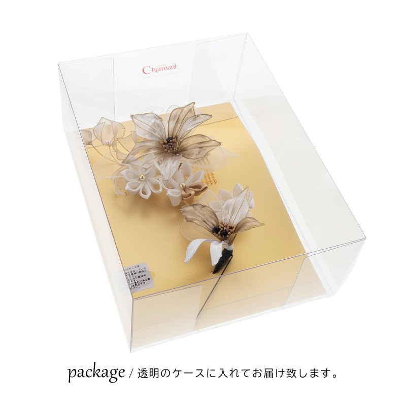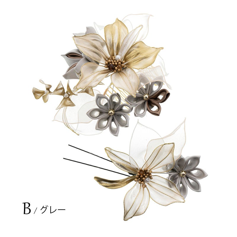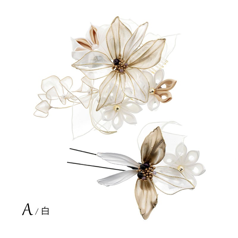 (卒業式応援75%SALE 2/19迄)成人式 髪飾り 卒業式 コームとUピンの2点セット「白・グレー ディップフラワーとつまみ、蘭」日本製 コーム Uピン 振袖用髪飾り 結婚式 前撮り 後撮り 着物【メール便不可】