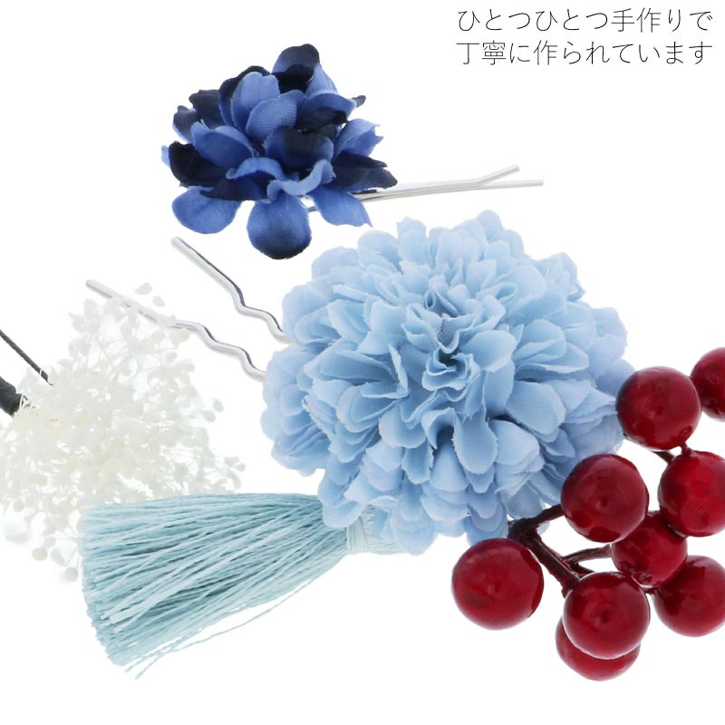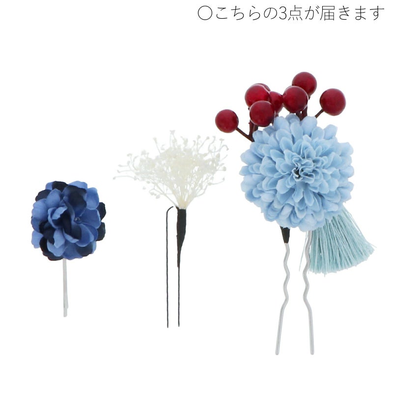【カラー】淡い空色のポンポンのようなお花に赤い実、ブルーグレーのタッセルのミニかんざし、細かな白花のUピン、ブルーとネイビーのお花のヘアピンの3点セットです。洋風アレンジにも◎