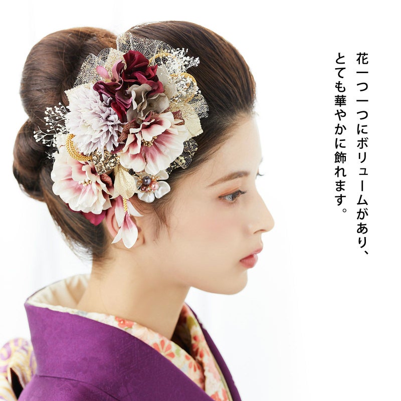振袖にぴったりのかわいくて華やかな髪飾りです。前撮り撮影、成人式、結婚式にはもちろん、卒業式の袴にも。