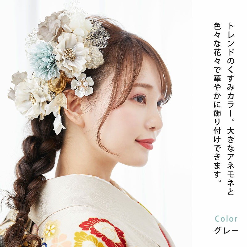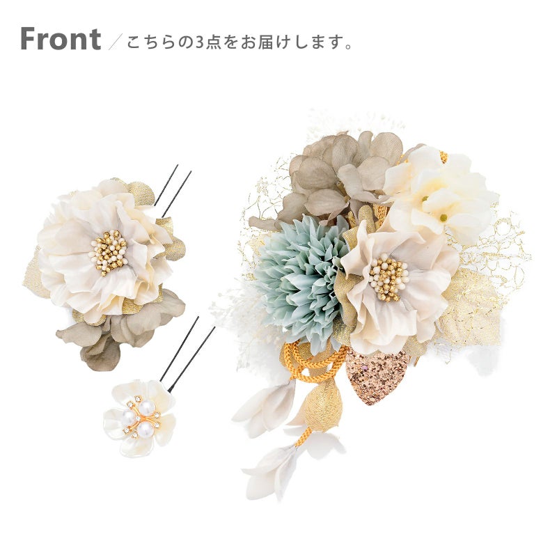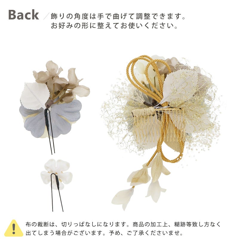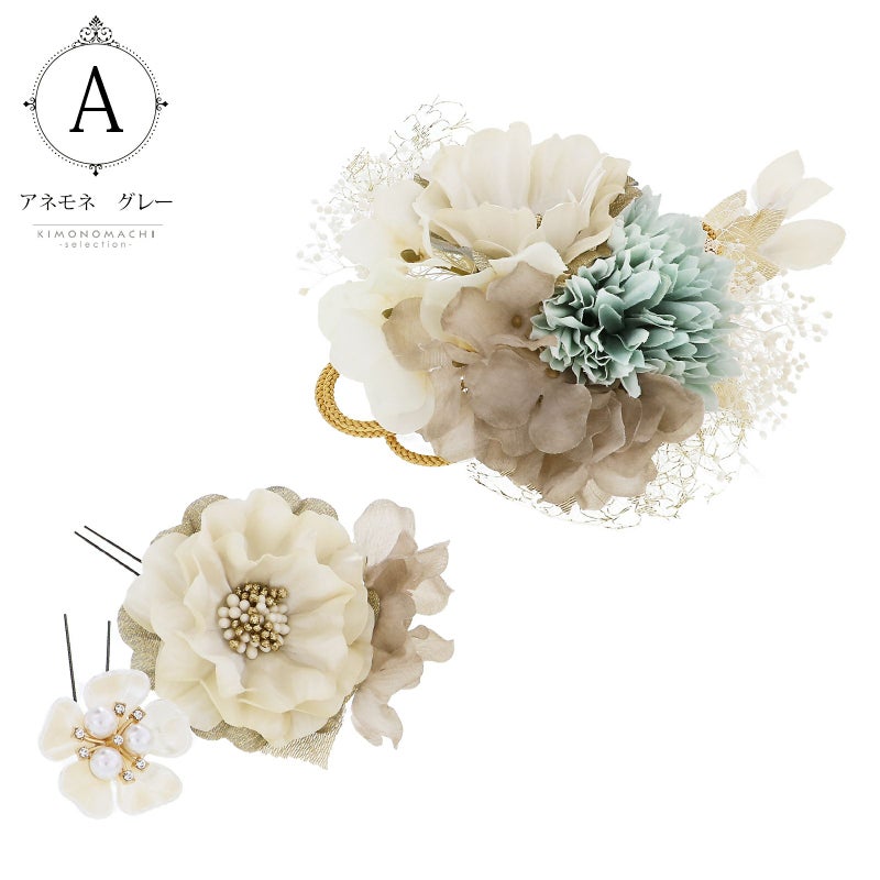 A.グレー:コームはパールホワイトと浅いゴールドの花びらに金と白のペップのアネモネや、グレージュとオフホワイトのアジサイ、淡いブルーグレーのマム、白のカスミソウ、ゴールドのリーフやチュール、組紐にゴールドやオフホワイトの花びらの房。Uピンはコームと同じアネモネに、グレージュのアジサイ。乳白色のアクリルの花びらに白色系のパールやビジューのお花。