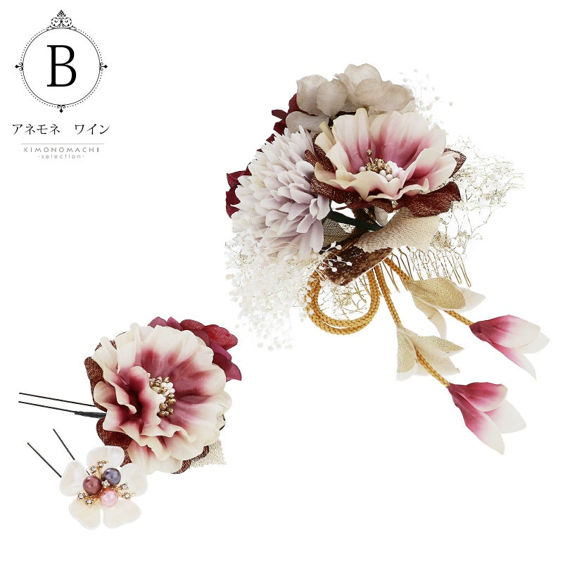 B.ワイン:コームはベージュに淡い赤紫ぼかしとダークゴールドの花びらに金と白のペップのアネモネや、グレージュとワインレッドのアジサイ、ごく淡い灰紫のマム、白のカスミソウ、ゴールドのリーフやチュール、組紐にゴールドや赤紫の花びらの房。Uピンはコームと同じアネモネに、ワインレッドのアジサイ。乳白色のアクリルの花びらに赤紫系のパールやビジューのお花。