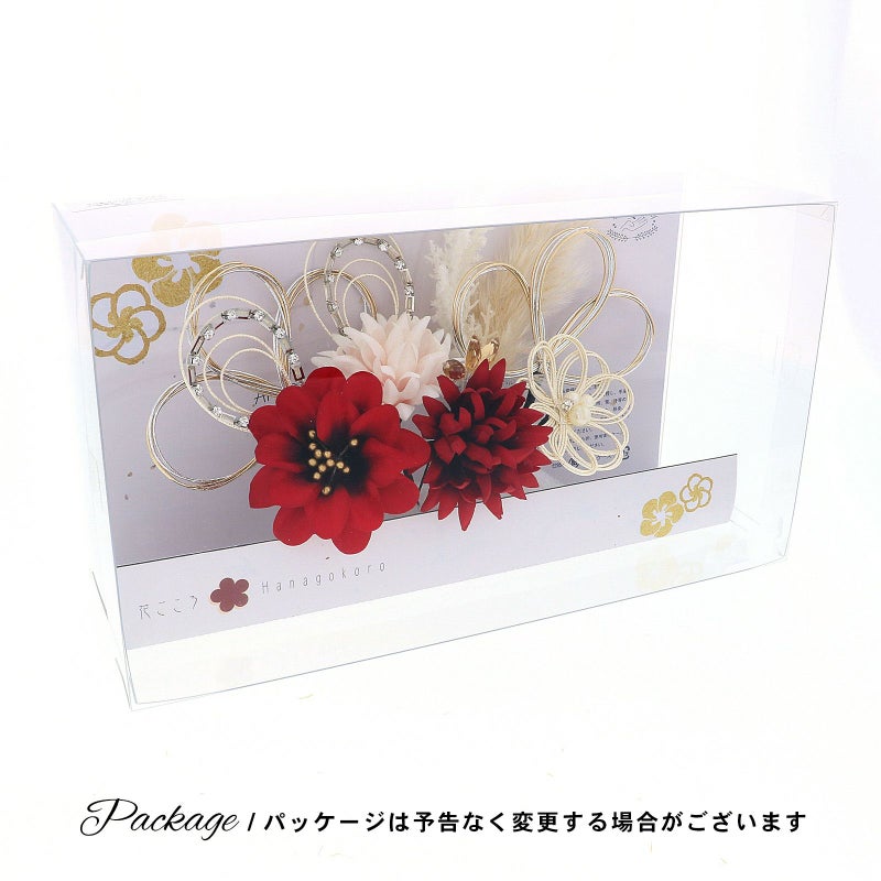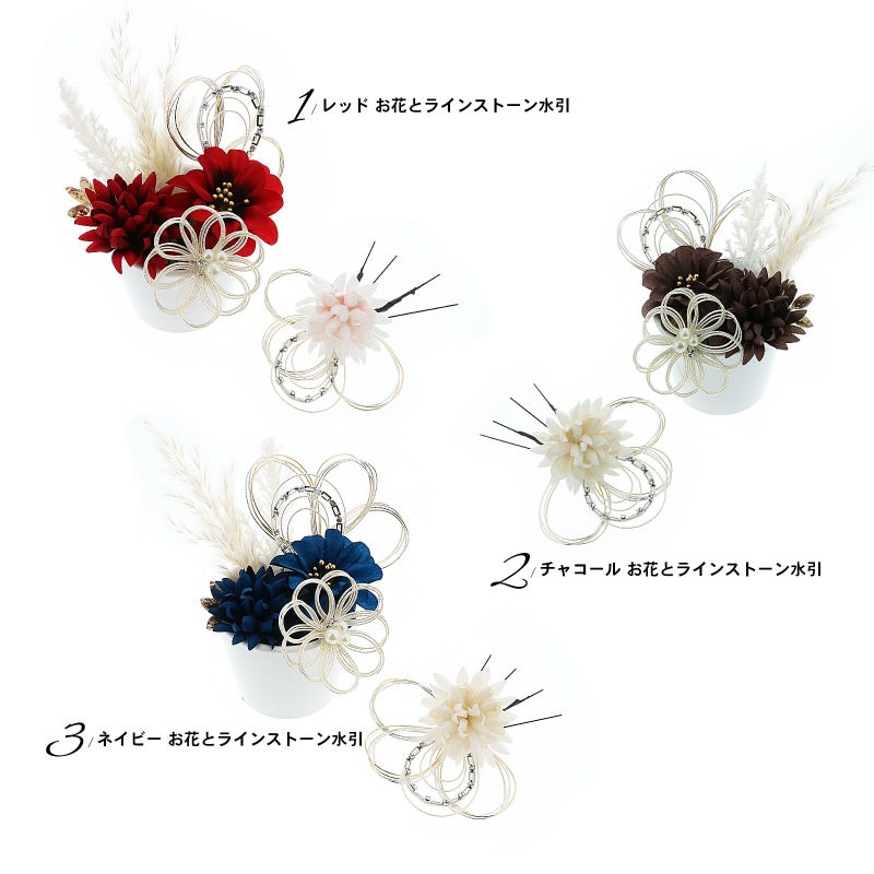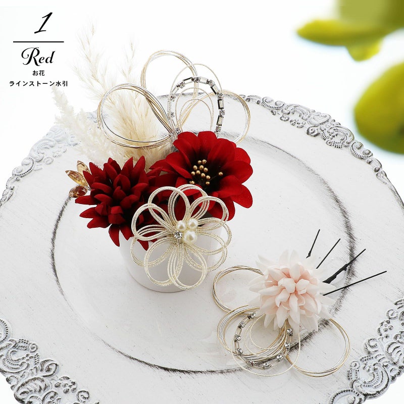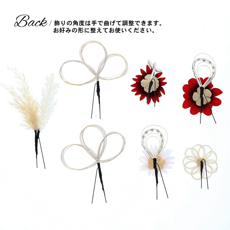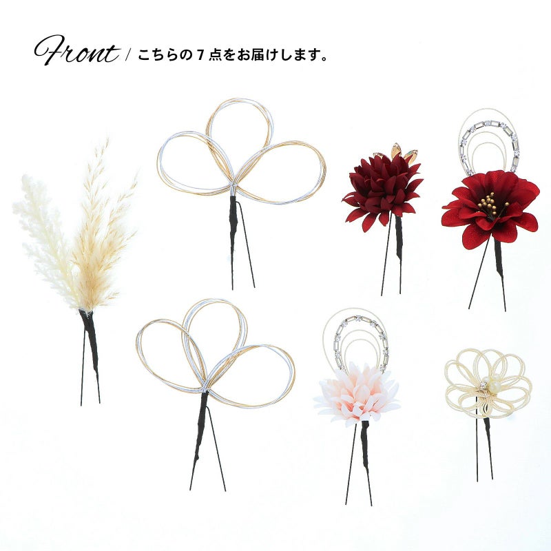 1.レッド お花とラインストーン水引:赤の花びらにゴールドペップのお花と、ホワイトゴールドの水引にラインストーンの輪を組み合わせたUピン1点。淡いピンクのマムとホワイトゴールドの水引にラインストーンの輪を組み合わせたUピン1点。深い赤のマムにアンバーのカットガラスを組み合わせたUピン1点。パールビーズとラインストーンにホワイトゴールドの水引のお花Uピン1点。金銀の水引の三つ輪飾りのUピン2点。白とベージュのパンパス、フェザーグラスのドライフラワーUピン1点。