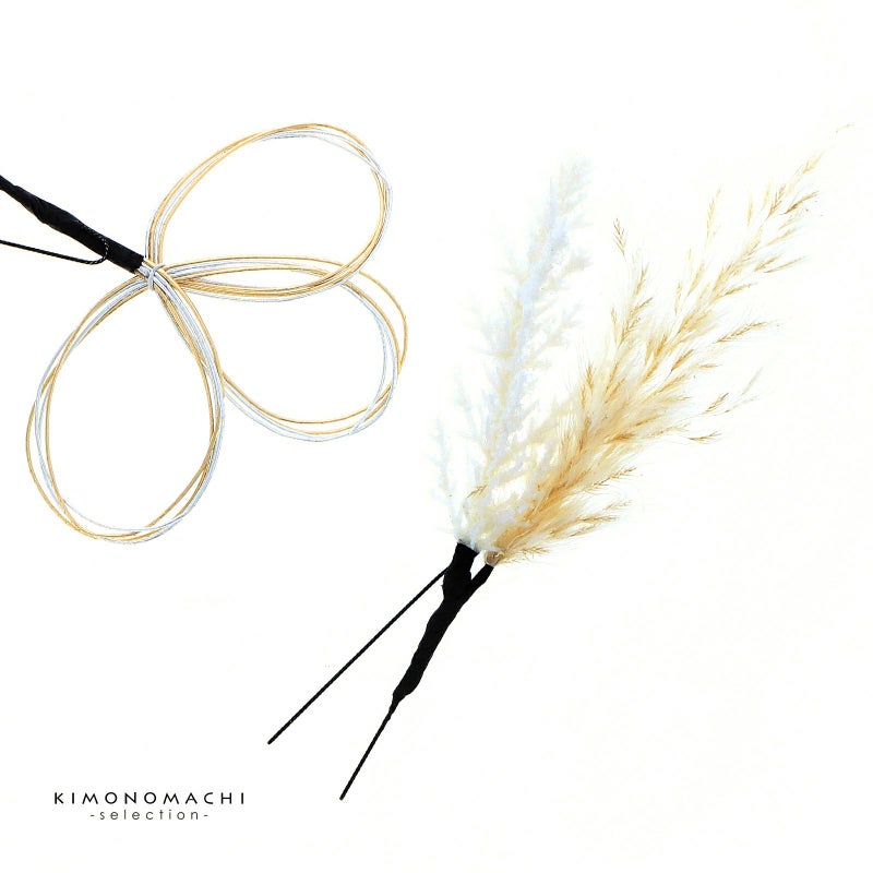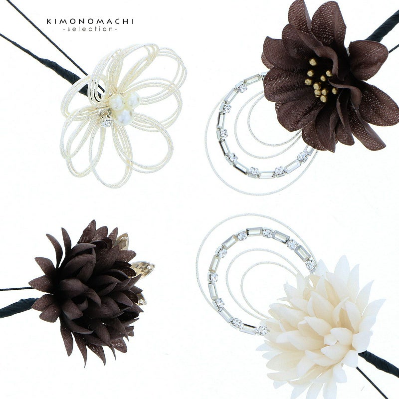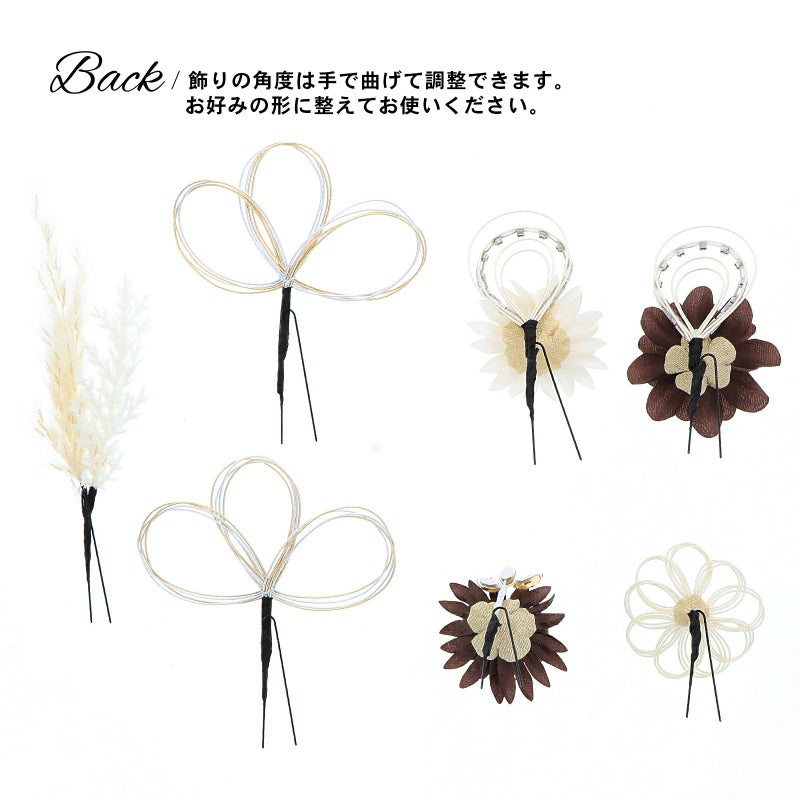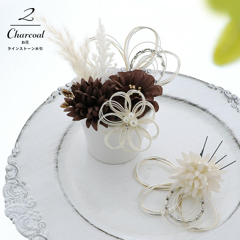 2.チャコール お花とラインストーン水引:チャコールの花びらにゴールドペップのお花と、ホワイトゴールドの水引にラインストーンの輪を組み合わせたUピン1点。アイボリーのマムとホワイトゴールドの水引にラインストーンの輪を組み合わせたUピン1点。チャコールのマムにアンバーのカットガラスを組み合わせたUピン1点。パールビーズとラインストーンにホワイトゴールドの水引のお花Uピン1点。金銀の水引の三つ輪飾りのUピン2点。白とベージュのパンパス、フェザーグラスのドライフラワーUピン1点。