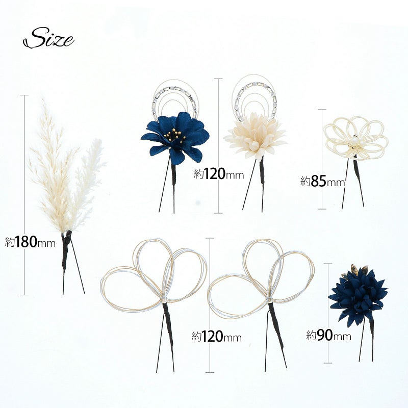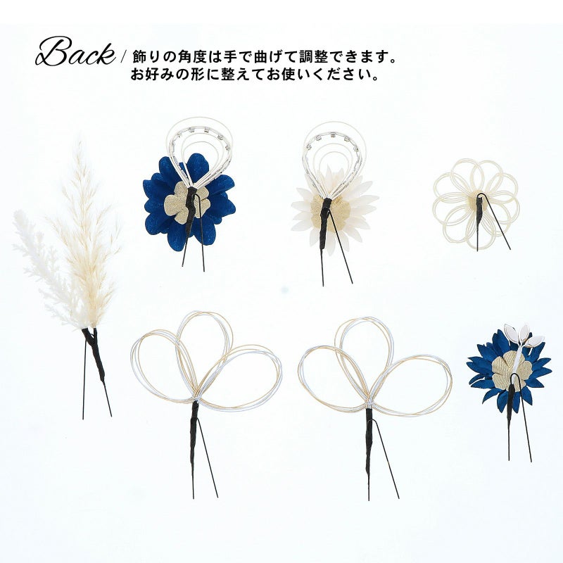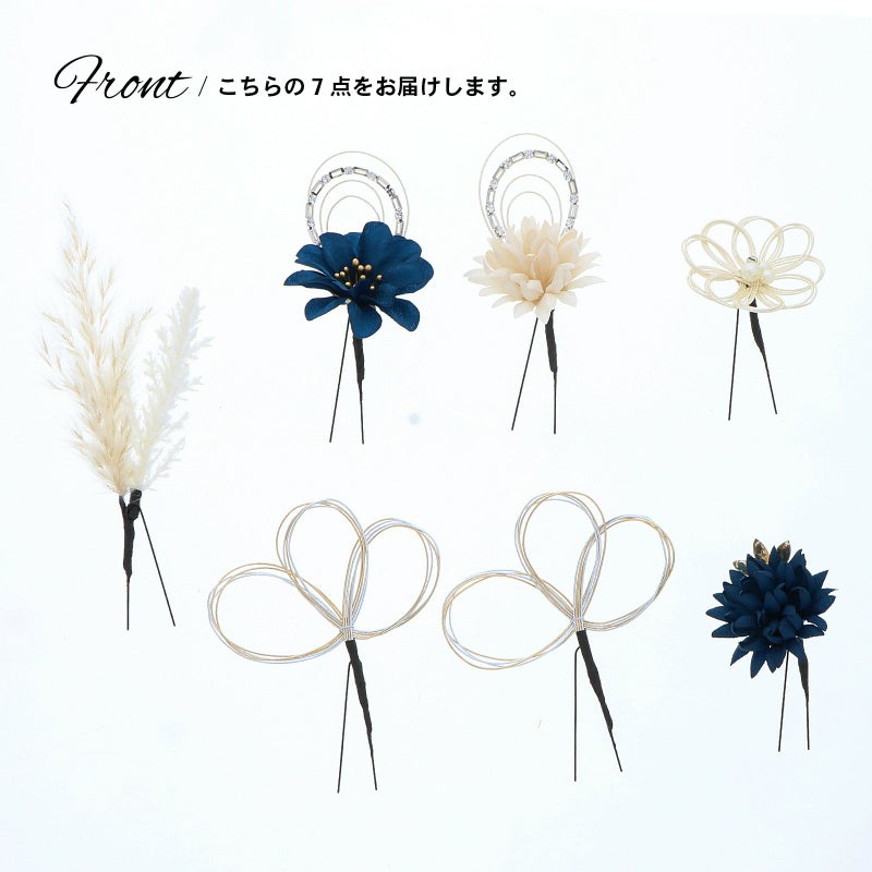 3.ネイビー お花とラインストーン水引:ダークブルーの花びらにゴールドペップのお花と、ホワイトゴールドの水引にラインストーンの輪を組み合わせたUピン1点。アイボリーのマムとホワイトゴールドの水引にラインストーンの輪を組み合わせたUピン1点。ネイビーのマムにアンバーのカットガラスを組み合わせたUピン1点。パールビーズとラインストーンにホワイトゴールドの水引のお花Uピン1点。金銀の水引の三つ輪飾りのUピン2点。白とベージュのパンパス、フェザーグラスのドライフラワーUピン1点。