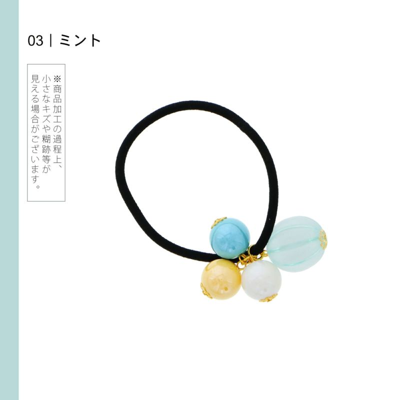 3ミント:キャンディのようなビーズ飾りのヘアゴム。淡いミントブルーの縞、浅いイエロー、アイスブルー、ミルキーホワイト。ゴールドの菊座。ゴム部分は黒。