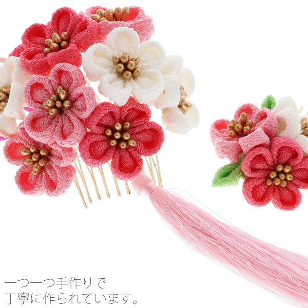【カラー】濃いピンク、淡いピンク、白色のつまみのお花。大きめのコームには、薄いピンク色の房飾り。