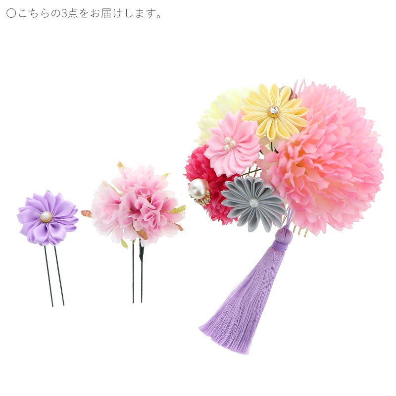 【カラー】コームは、明るいピンクのふんわりと大きなお花、淡いクリーム色の花、赤紫みのピンクの丸い花。淡いグレー、薄黄色、淡いピンクのリボンのつまみのお花。パープルのタッセル。白のパールビーズやラインストーン、金のチャームがポイント。Uピンは淡いピンクの丸いお花、薄紫色のリボンのつまみの花の2点。