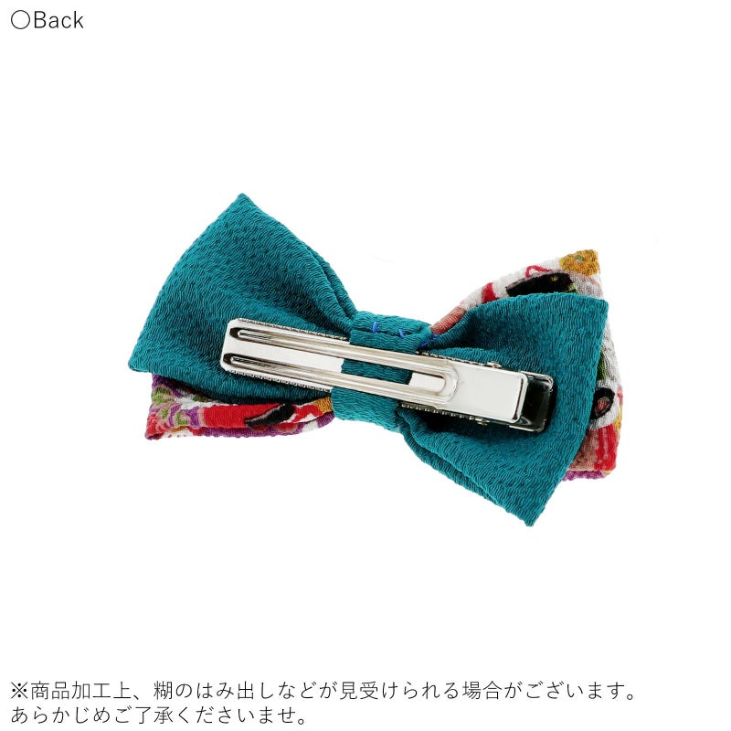 4紫系×ターコイズ…紫色の地に、藤色や緑、朱色の和風の柄のリボンと、深いターコイズ系の青緑のリボンを重ねたクリップ。