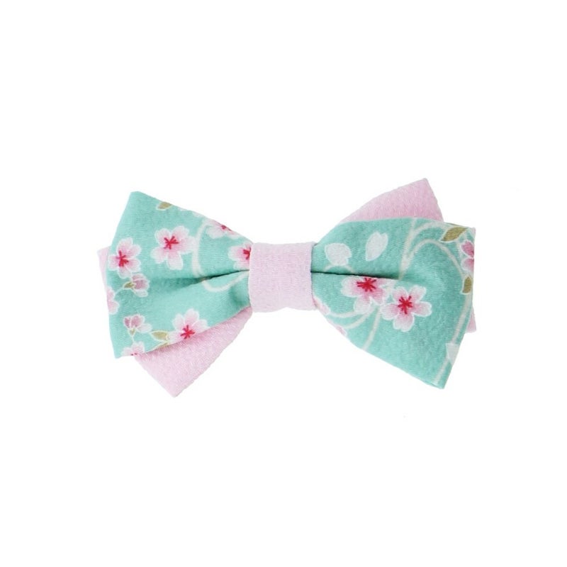2小桜ミントグリーン×薄ピンク色…ミント系の水色地に白やピンクの小桜の柄のリボンと、淡いピンクのリボンを重ねたクリップ。