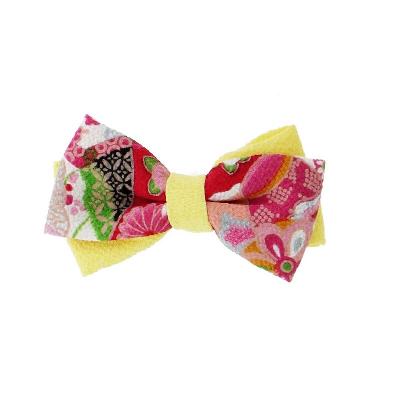5和柄赤系×イエロー…赤や深いピンク色を基調に黒や緑などの配色の和風の柄のリボンと、明るいクリームイエローのリボンを重ねたクリップ。