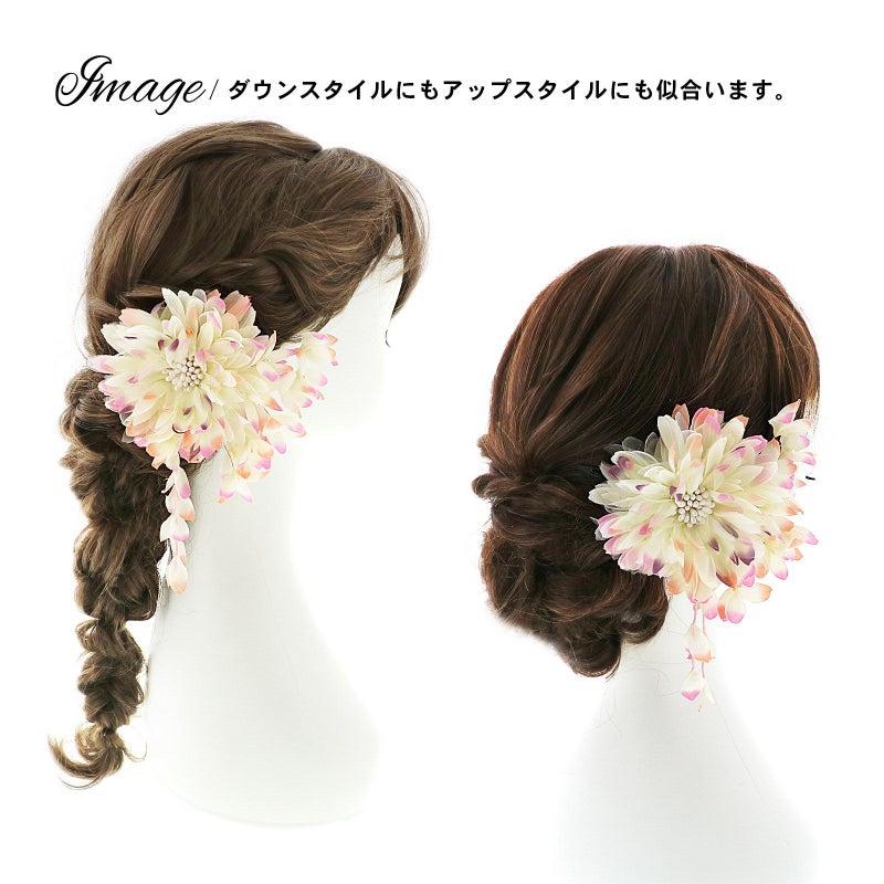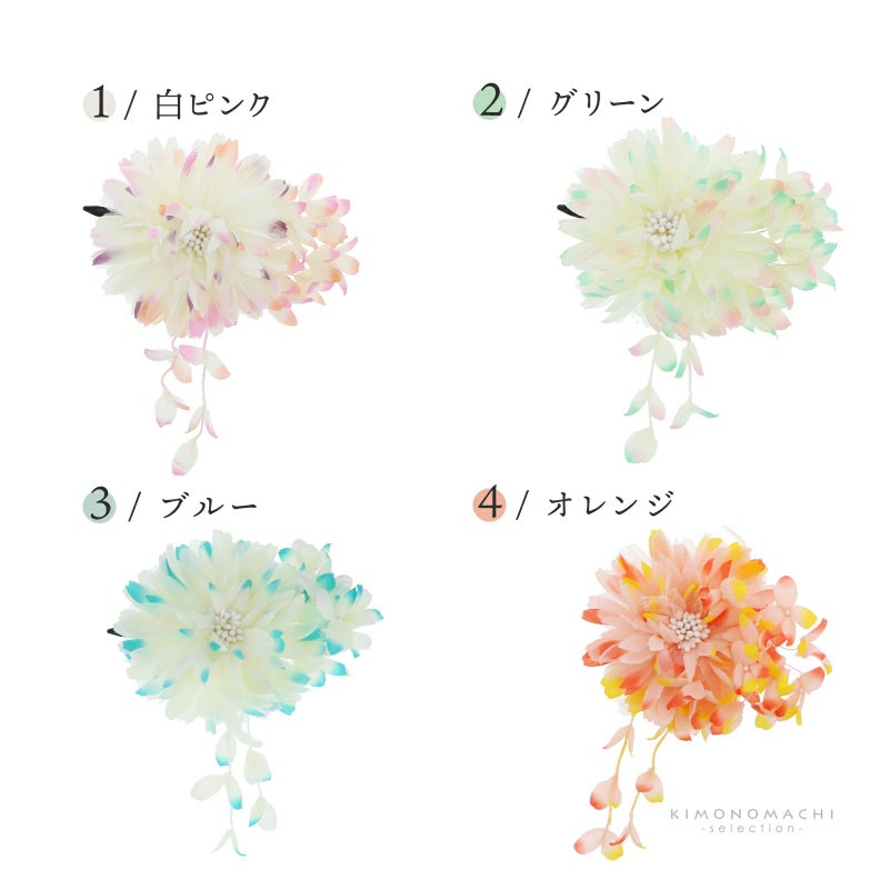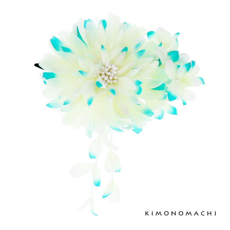 爽やかな色合いのお花に下がり飾りがかわいいお花髪飾りです。