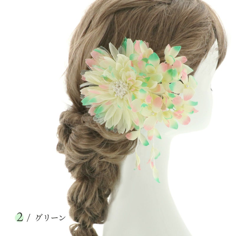 2グリーン…淡いクリーム色の地に、先端が淡いミントグリーンや薄ピンクの花びら。大きなダリア風のお花に小花、房下がりのデザインです。
