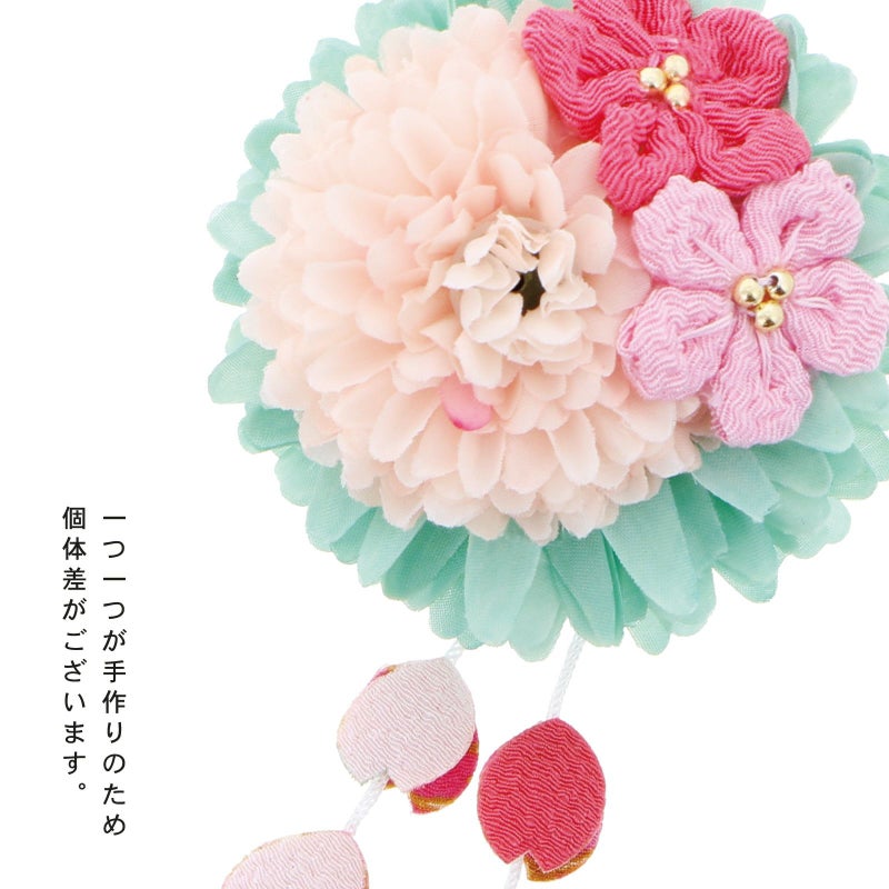 丸いお花に、花びら型の下がり飾りがかわいいお花髪飾りです。