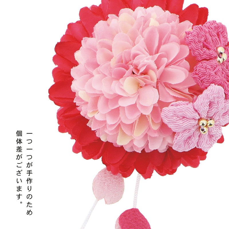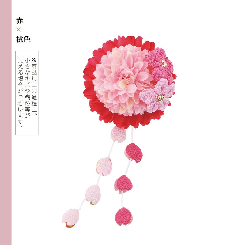 2赤×桃色…浅い赤色と、ピンク色を重ねた丸いお花。サイドに濃いピンクと薄ピンクのつまみの花、ゴールドのビーズ。ピンク色系の桜の形の房飾り。