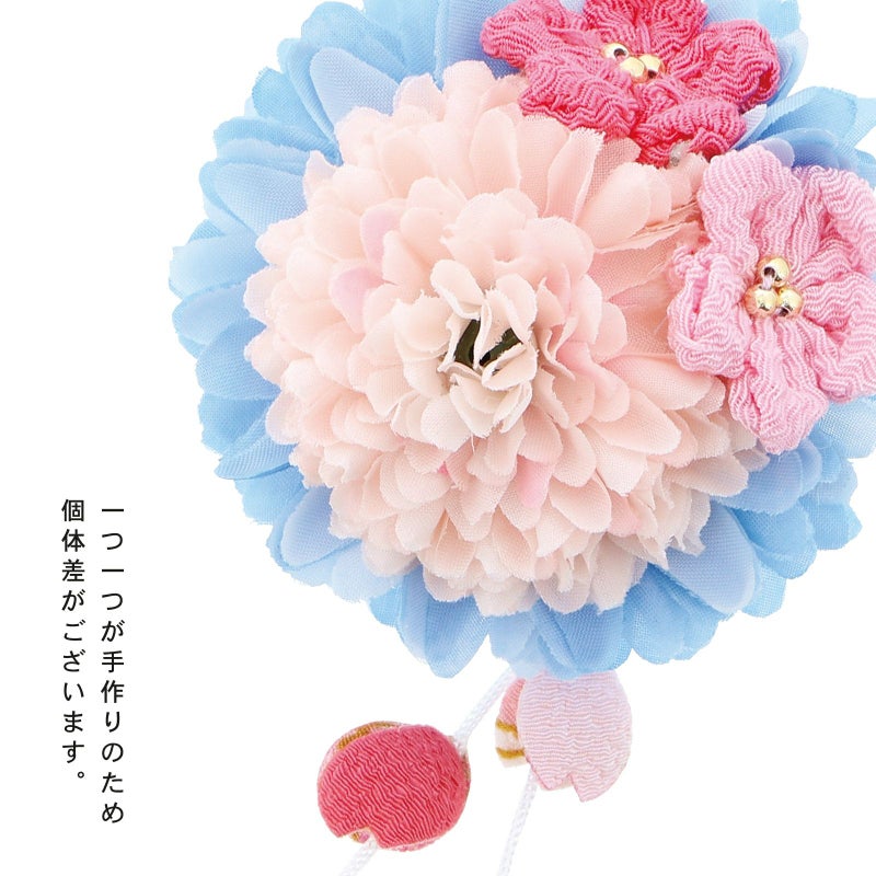 3空色×薄桃色…淡いブルーと、浅いピンク色を重ねた丸いお花。サイドに濃いピンクと薄ピンクのつまみの花、ゴールドのビーズ。ピンク色系の桜の形の房飾り。