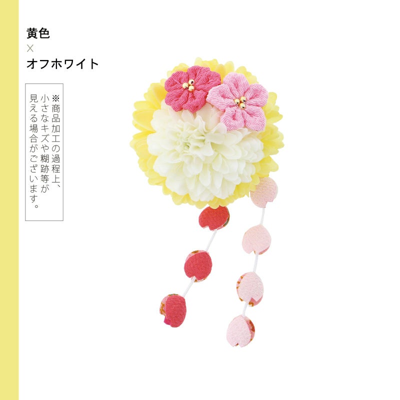 4黄色×オフホワイト…明るい黄色と、クリーム色を重ねた丸いお花。サイドに濃いピンクと薄ピンクのつまみの花、ゴールドのビーズ。ピンク色系の桜の形の房飾り。