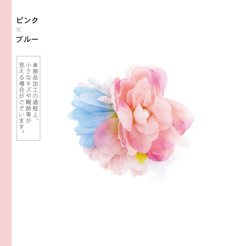 1ピンク×ブルー…花びらに紫、濃ピンクのぼかしの入ったピンクのお花、薄ピンク、淡いブルーの花びら、白いチュール、ペップを組み合わせたクリップの髪飾りです。