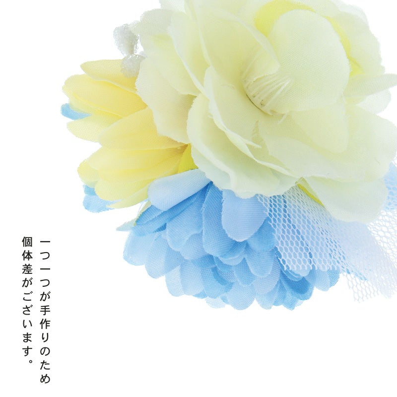 2クリーム×ブルー…クリーム色のお花、ライトイエロー、淡いブルーの花びら、白いチュール、ペップを組み合わせたクリップの髪飾りです。
