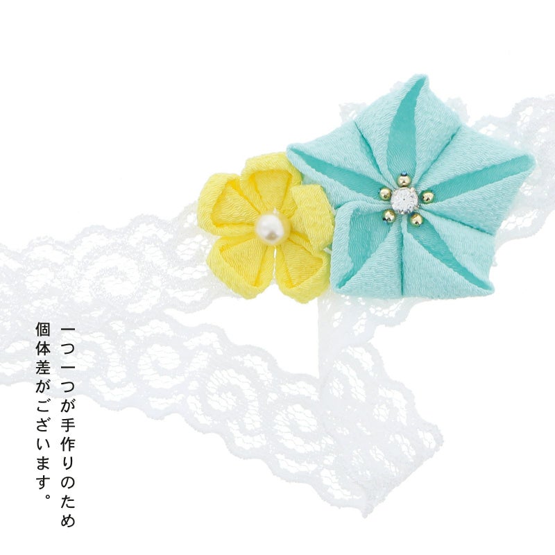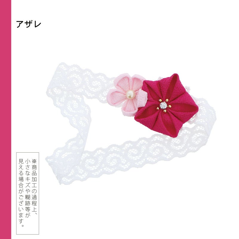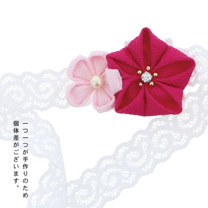 お宮参りやお食い初め、初節句などのお子様の成長のお祝いに、また、お正月や結婚式での装いに、お着物や袴姿の和の装いにぴったりなつまみ細工とストレッチレースのヘアバンド髪飾りです。