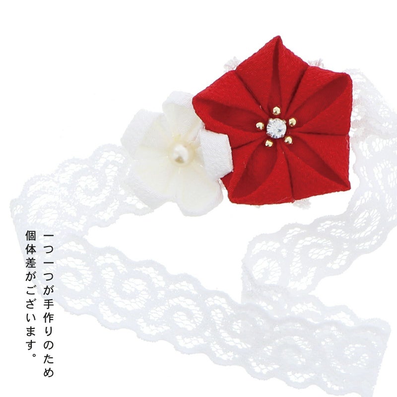 2レッド…白いレースに、深いレッドのつまみのお花と、白のお花。お花の中心に、それぞれラインストーンやパールビーズ。