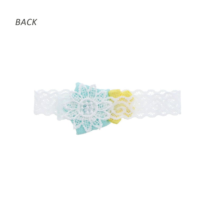 1ミント…白いレースに、ミントブルーのつまみのお花と、明るい黄色のお花。お花の中心に、それぞれラインストーンやパールビーズ。