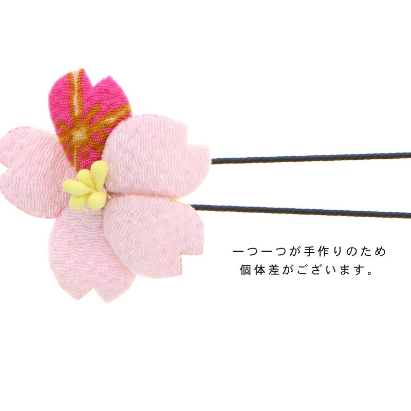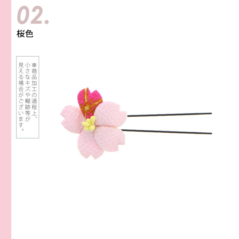 02桜色…浅い薄ピンク色の花びらのうち、1枚は桃色地の和柄の縮緬、薄黄色の蕊を組み合わせた1輪の桜の花飾り。