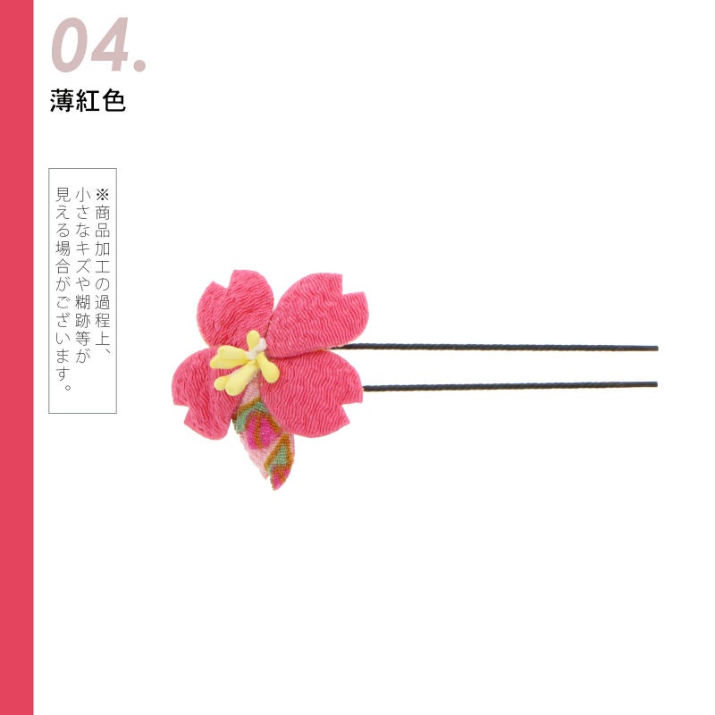 03赤色…深い赤色の花びらのうち、1枚はピンク色地の和柄の縮緬、薄黄色の蕊を組み合わせた1輪の桜の花飾り。