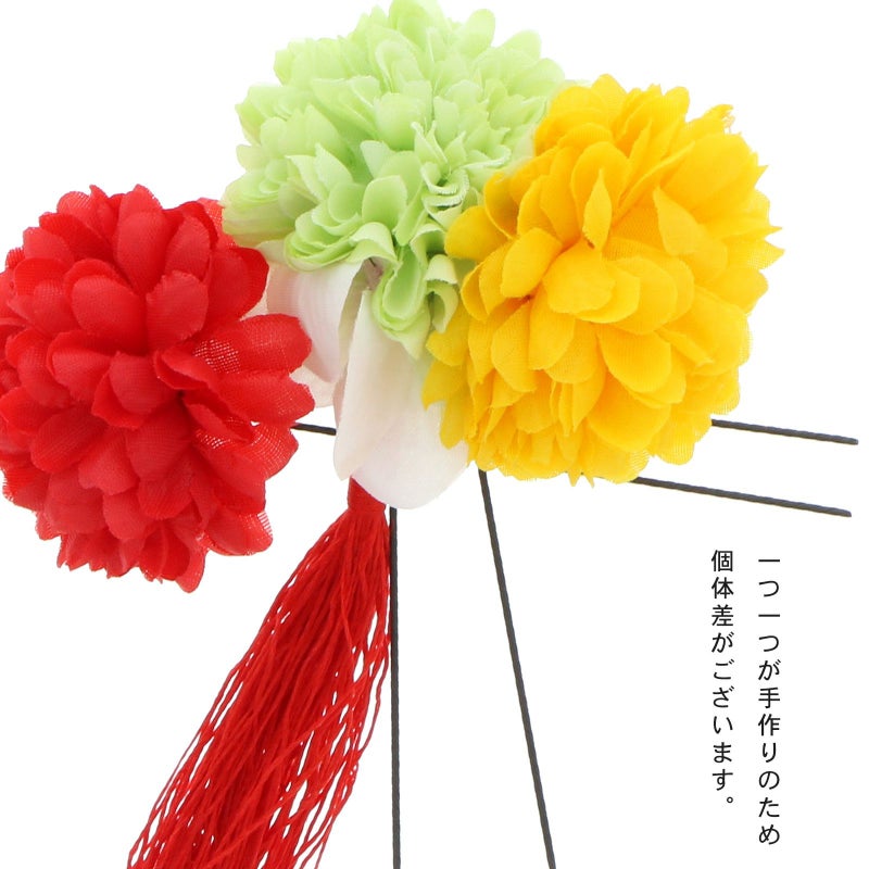 01.薄緑×黄色×赤、赤…1点は淡いアップルグリーン、黄色のマムに白のお花、つやのある赤いタッセル。もう1点は明るい赤のマム。