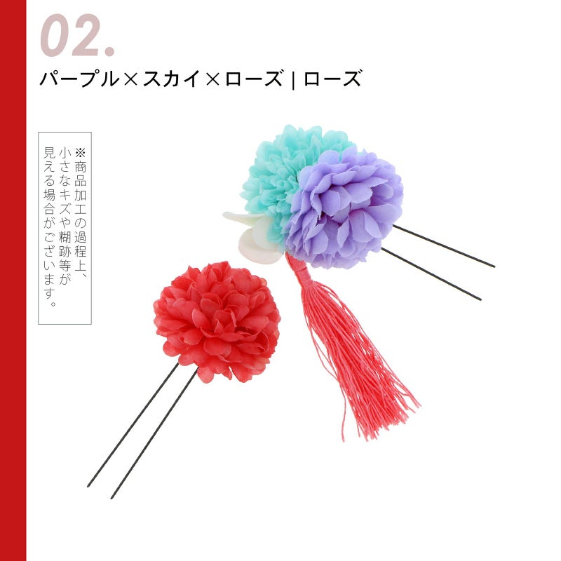 02.パープル×スカイ×ローズ、ローズ…1点は淡いパープル、スカイブルーのマムに白のお花、つやのある桃色のタッセル。もう1点はやわらかいローズレッドのマム。