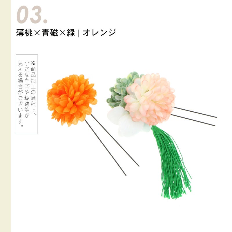 03.薄桃×青磁×緑、オレンジ…1点は淡い桃色ぼかし、淡いアンティークグリーンのマムに白のお花、つやのある緑のタッセル。もう1点は明るいオレンジのマム。