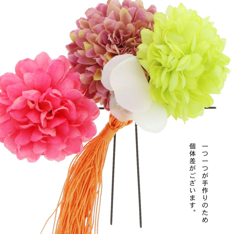 小ぶりのお花2つにタッセルがついたかわいい髪飾りです。他の髪飾りと合わせて華やかさをアップする付け足し髪飾りとしても。
