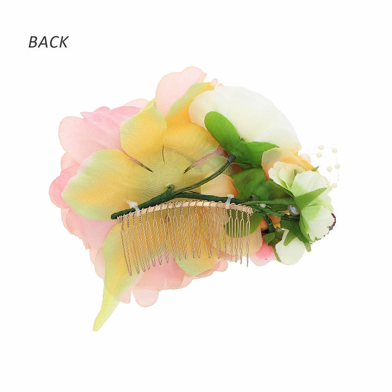 ラメ感のある淡いピンクの大輪のお花、淡いオレンジ、ピンク、淡いクリーム色などの大小のお花。白色系のパールビーズ飾り。