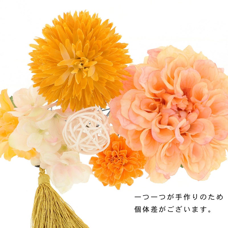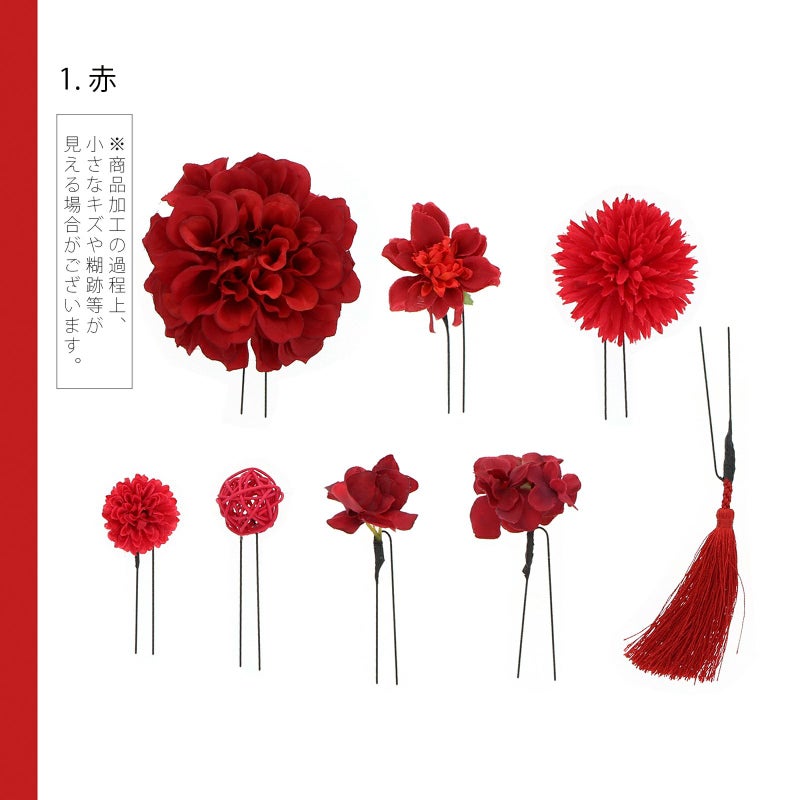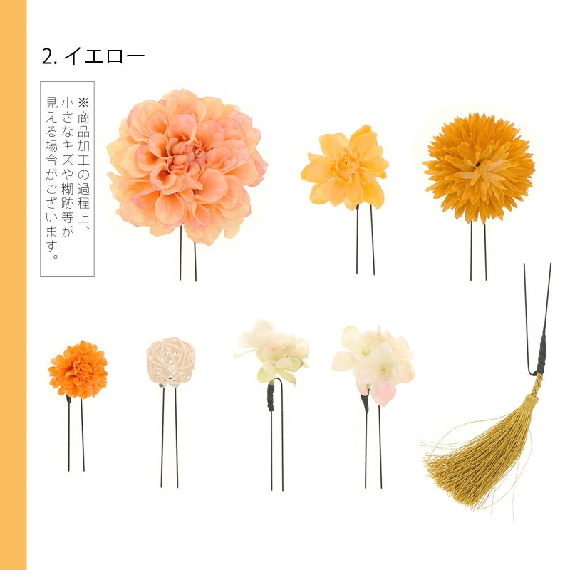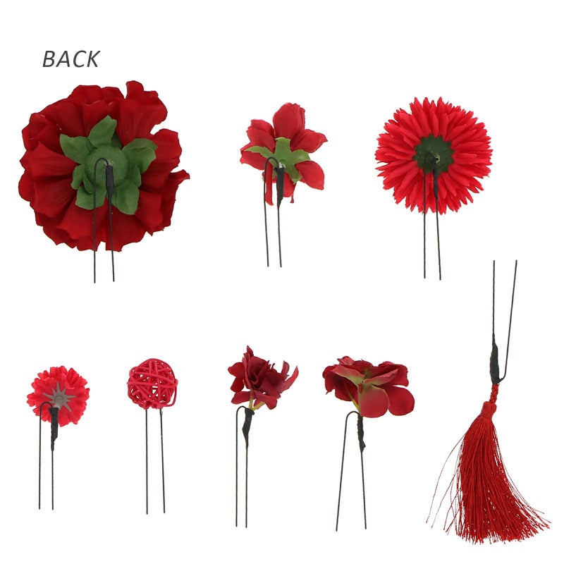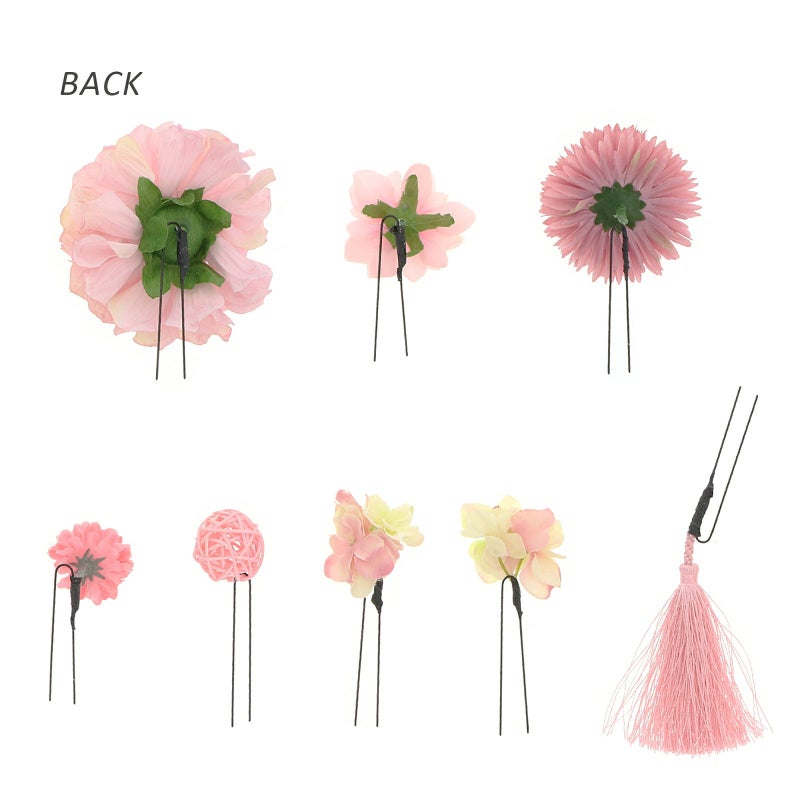お花とマムと房飾りをセットにしたUピンタイプの髪飾り8点セットです。散らしてつけても、まとめてつけてもオススメです。他の髪飾りと組み合わせて。