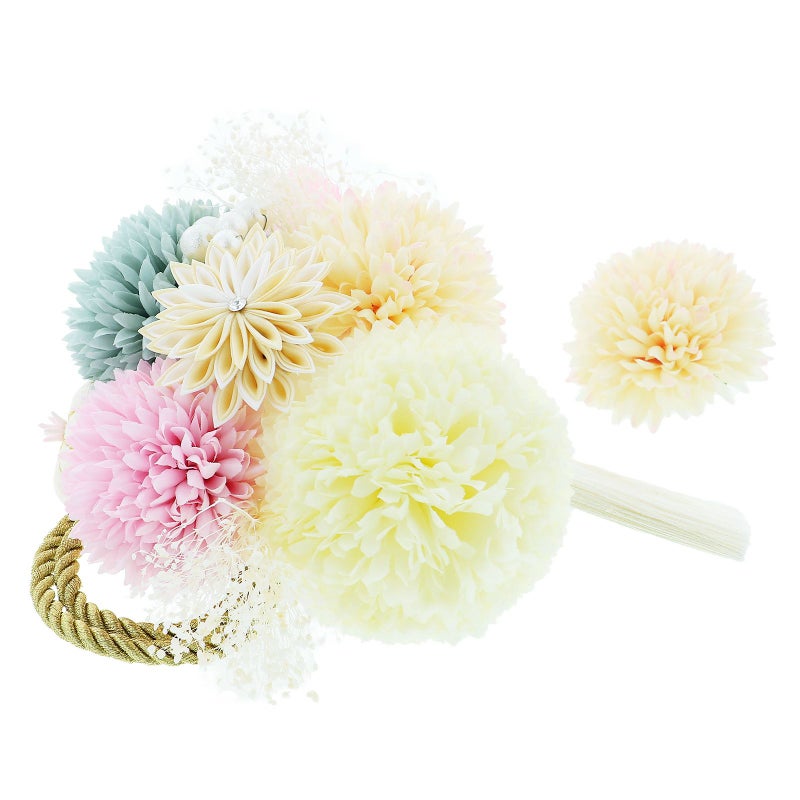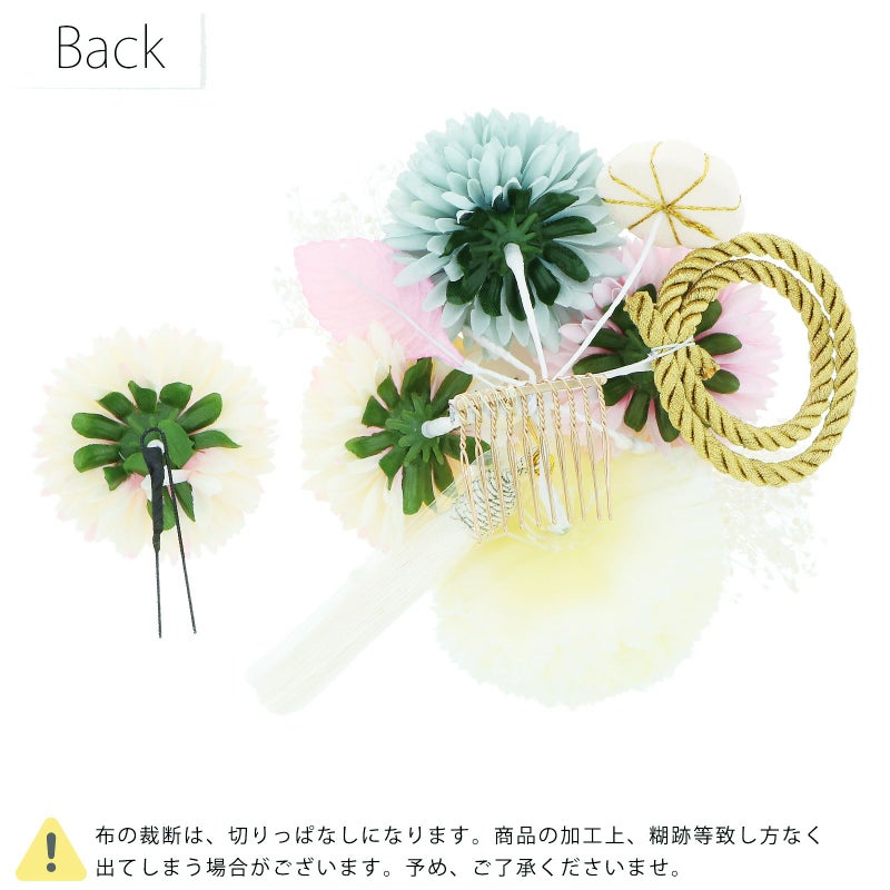 コームは、白と明るいベージュの剣菊、クリーム色やピンク、スモークブルーのマム、ピンクのリーフ、アイボリーのちりめんの万寿菊やカスミソウ、コットンパールにゴールドの組紐、オフホワイトのタッセル。Uピンは、クリーム色に淡いピンクの挿し色のマム。