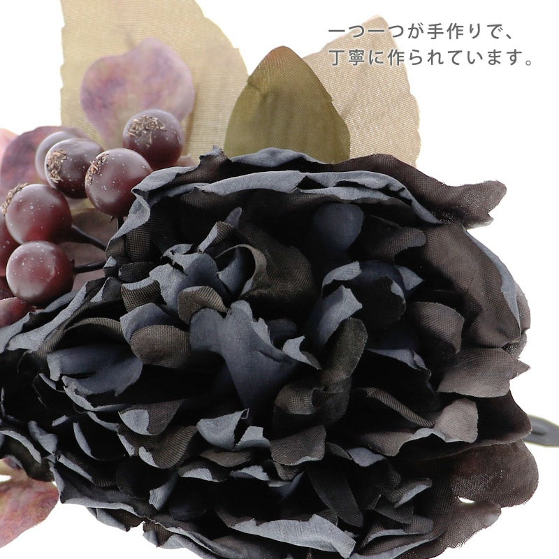1.ブラック・・・黒とくすんだネイビーの花びらの大きなお花に赤紫の実、赤紫色にくすんだ黄緑のぼかしのアジサイや葉。