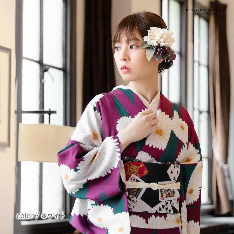 2.ホワイト・・・オフホワイトとくすんだアイボリーの花びらの大きなお花に赤紫の実、赤紫色にくすんだ黄緑のぼかしのアジサイや葉。