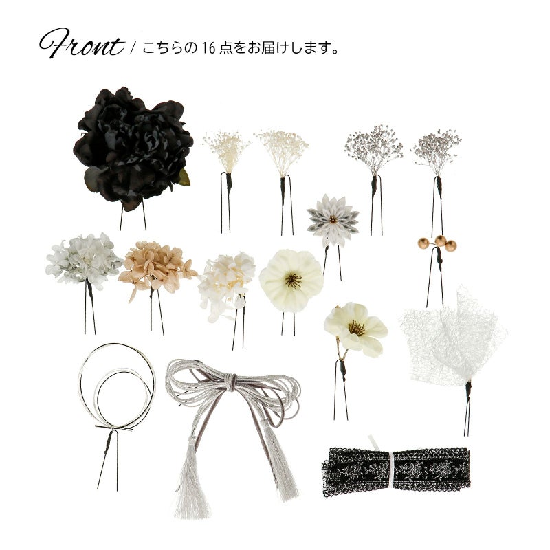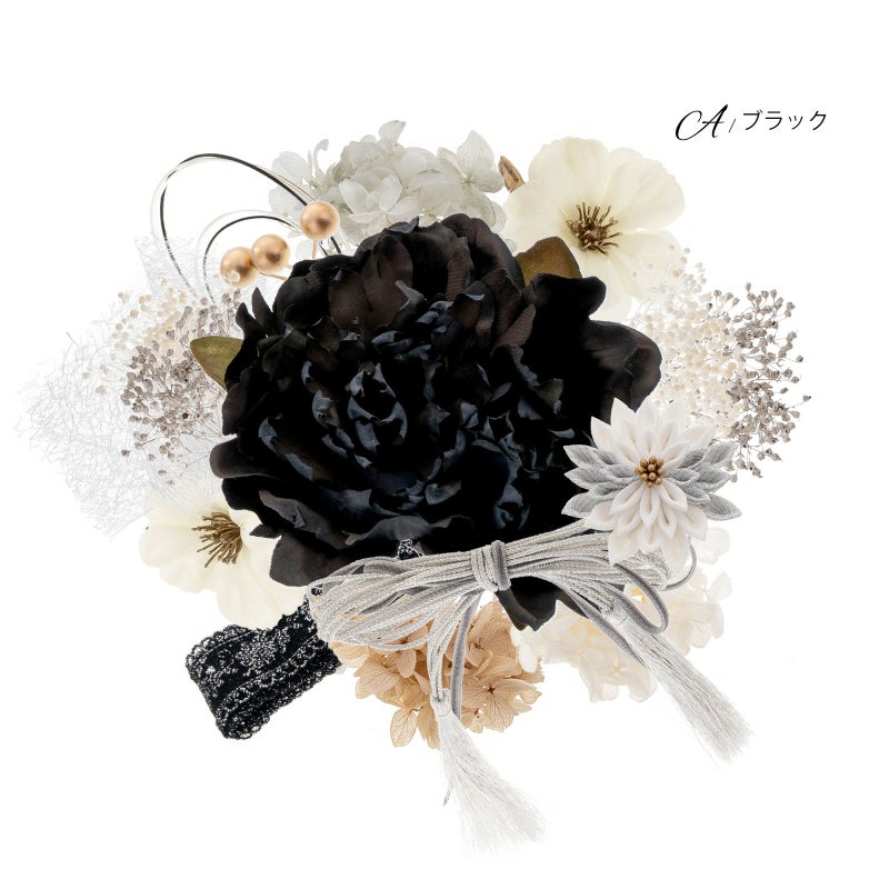 A.ブラック:黒やチャコール、くすんだ緑の花びらの大きなお花のUピン1点。シルバー、グレーのタッセル付きリボンのUピン1点。黒地にメタリックシルバーのレースリボン1点。シルバー、黒の水引の輪飾りUピン1点。白とシルバーストライプのつまみのお花のUピン1点。アジサイのUピン、淡いブルーグレーにシルバー1点、くすんだピンクベージュ1点、白1点。ゴールドの蕊のオフホワイトのお花のUピン2点。カスミソウのUピン、シルバー2点、白2点。白のチュールのUピン1点。