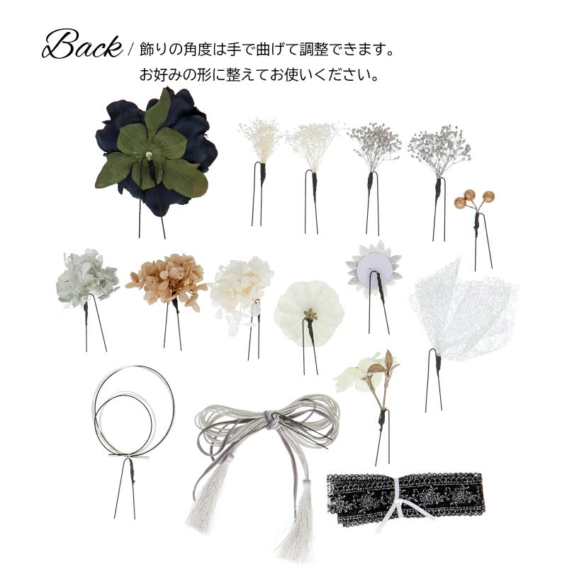 こちらの髪飾りは、Uピン仕様のセットで装着も簡単。ショートヘアからロングヘアまで、髪型を気にせずにお使いいただけます。ヘアスタイルに合わせて、髪飾りのボリュームが調整できます。また、お好みの位置に分けてアレンジが可能です。