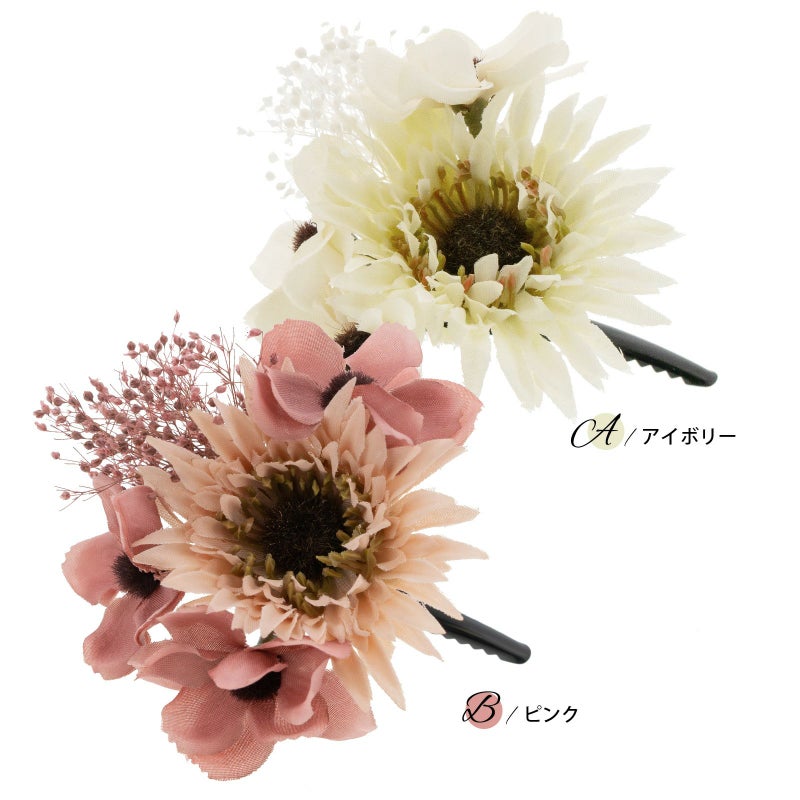 A.アイボリー…アイボリーの花びらに深いモスグリーンの蕊のガーベラ、オフホワイトの花びらにこげ茶色の蕊の小花、白いカスミソウを組み合わせクリップ。