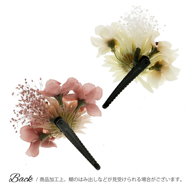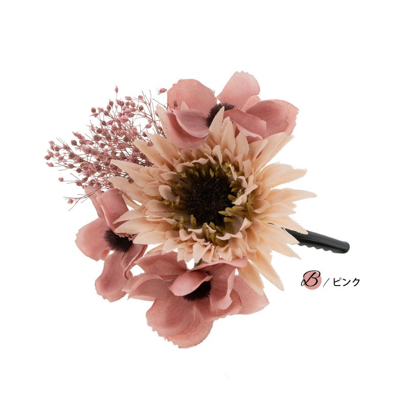 B.ピンク…くすんだ淡いピンクの花びらにこげ茶色の蕊のガーベラ、浅い赤紫の花びらにこげ茶色の蕊の小花、赤紫色のカスミソウを組み合わせクリップ。
