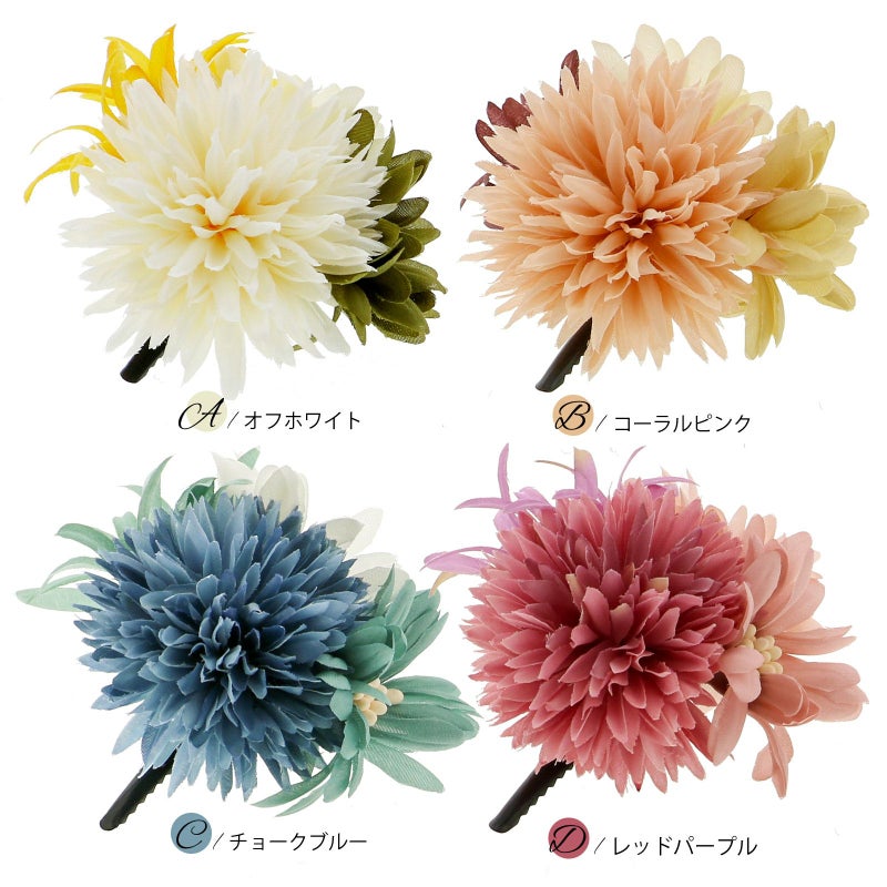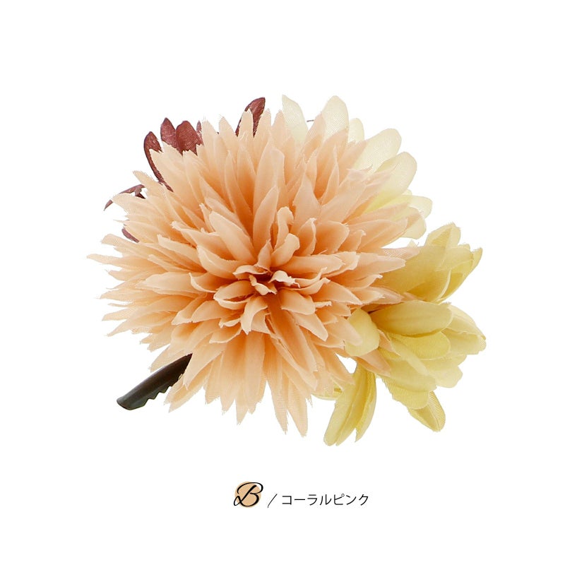 B.コーラルピンク…浅いコーラルピンクのマムに、ベージュとオフホワイトのお花、灰紫色の細いリリーを組み合わせたクリップ。