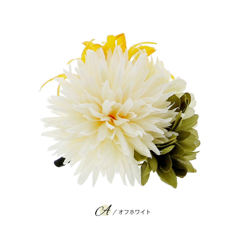 A.オフホワイト…オフホワイトのマムに、モスグリーンとオフホワイトのお花、深い黄色の細いリリーを組み合わせたクリップ。