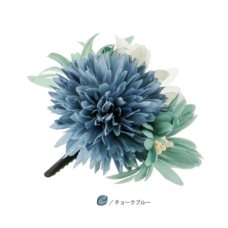 C.チョークブルー…ややグレイッシュな浅いブルーのマムに、浅いターコイズブルーとオフホワイトのお花、浅いターコイズブルーの細いリリーを組み合わせたクリップ。