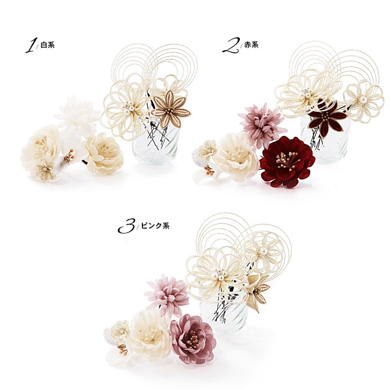 3. (卒業式応援75%SALE 2/19迄)成人式 髪飾り 卒業式 Uピンの7点セット「つまみと水引、カメリア 白系・赤系・ピンク系」日本製 水引き Uピン 振袖用髪飾り 結婚式 前撮り 後撮り 着物【メール便不可】