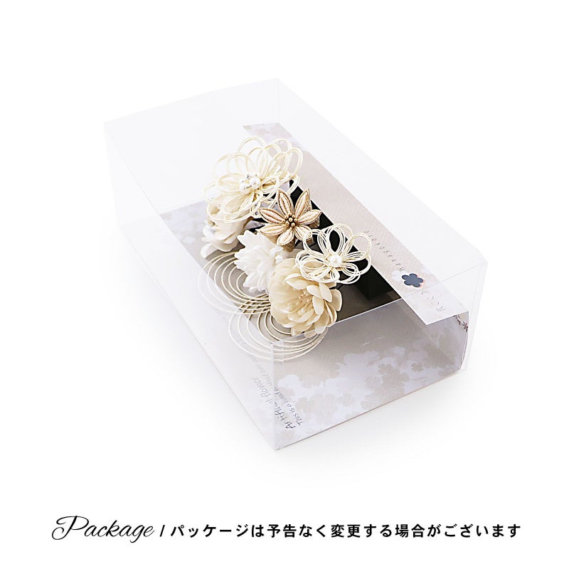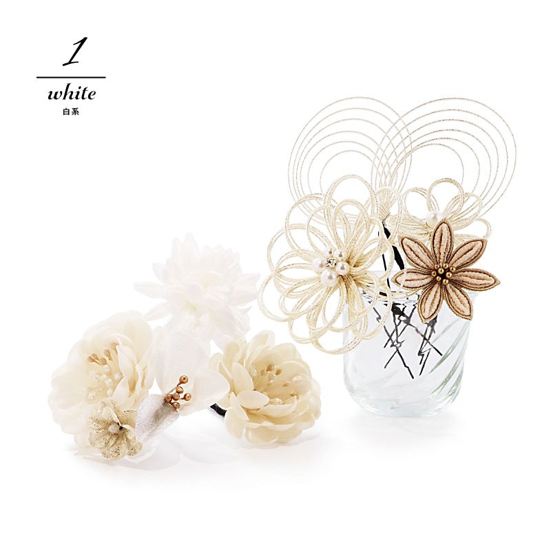 1.白系:ベージュとゴールドの剣つまみのお花1点。白金の水引にパールビーズのお花大1点、小1点。白のマム1点。淡いベージュの花びらにラメのペップのカメリア1点。淡いベージュ系のカメリアと小花1点。白金の水引の輪飾り1点。