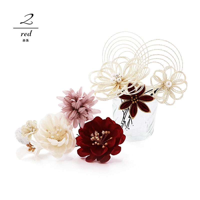 2.赤系:深い赤とゴールドの剣つまみのお花1点。白金の水引にパールビーズのお花大1点、小1点。くすみピンクのマム1点。深い赤の花びらにラメのペップのカメリア1点。淡いベージュ系のカメリアと小花1点。白金の水引の輪飾り1点。