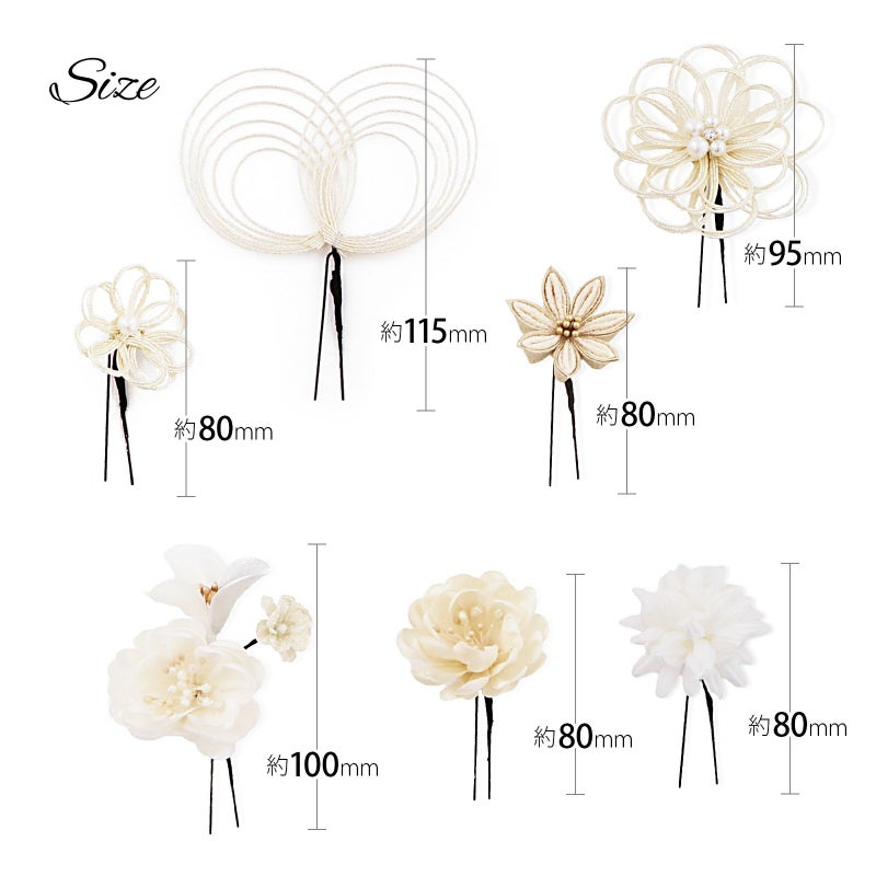 【サイズ】Uピンお花髪飾り:約8cm、約8.5cm、約10cm 水引タイプ髪飾り:約11.5cm、約9.5cm