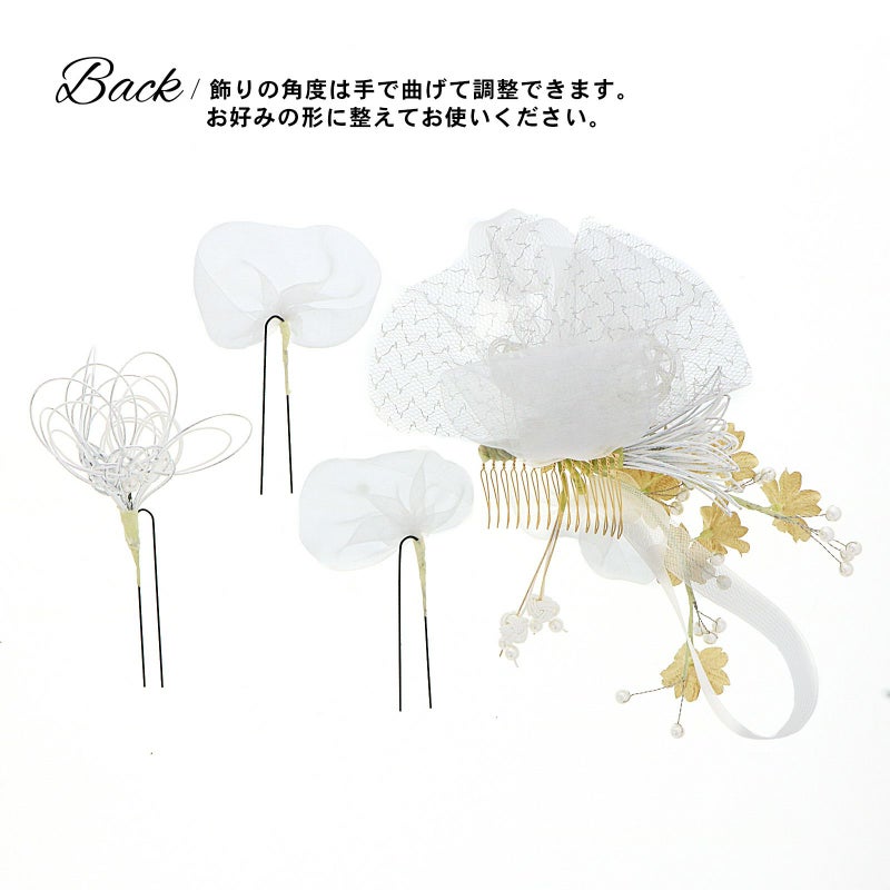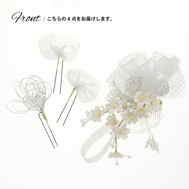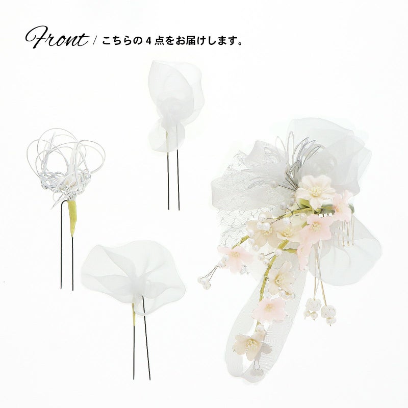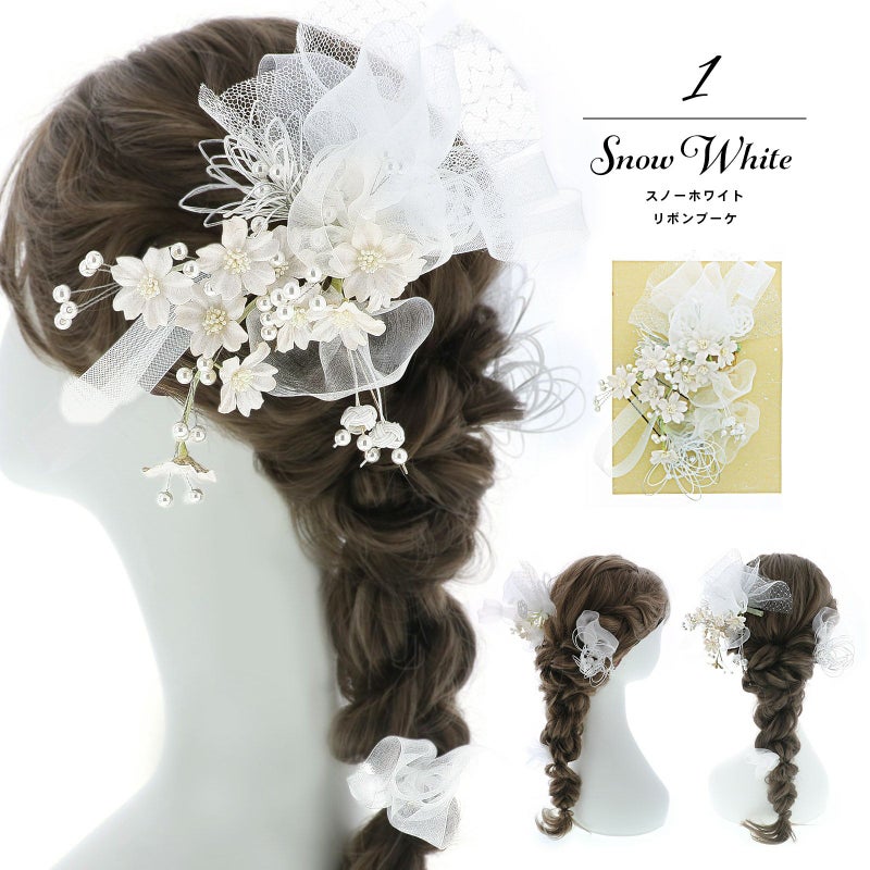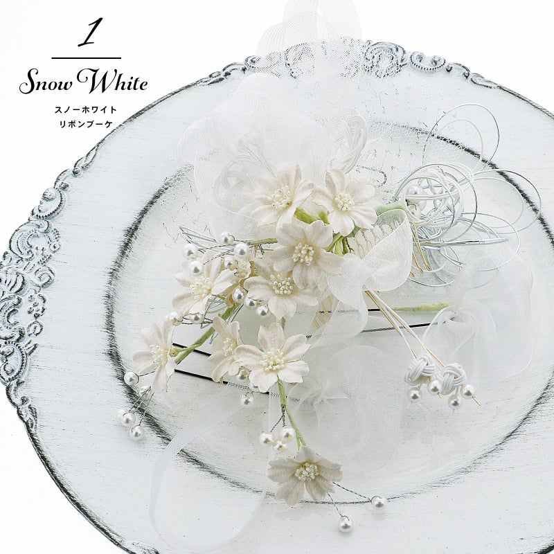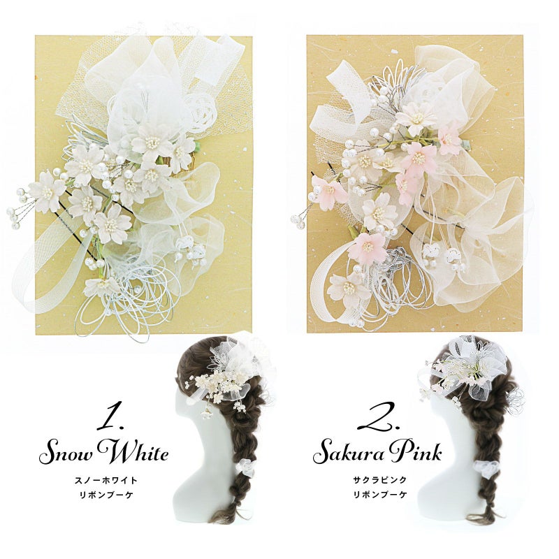 1.スノーホワイト リボンブーケ:表オフホワイトに裏ゴールド生地の桜の小花にパールや水引の蕾、白のカールしたチュールリボンやオーガンジーリボン、シルバーとホワイトの水引の百合の花を組み合わせたコーム1点。パールビーズの蕊に白と銀水引を結んだ花飾りUピン1点。白のオーガンジーリボン飾りのUピン2点。