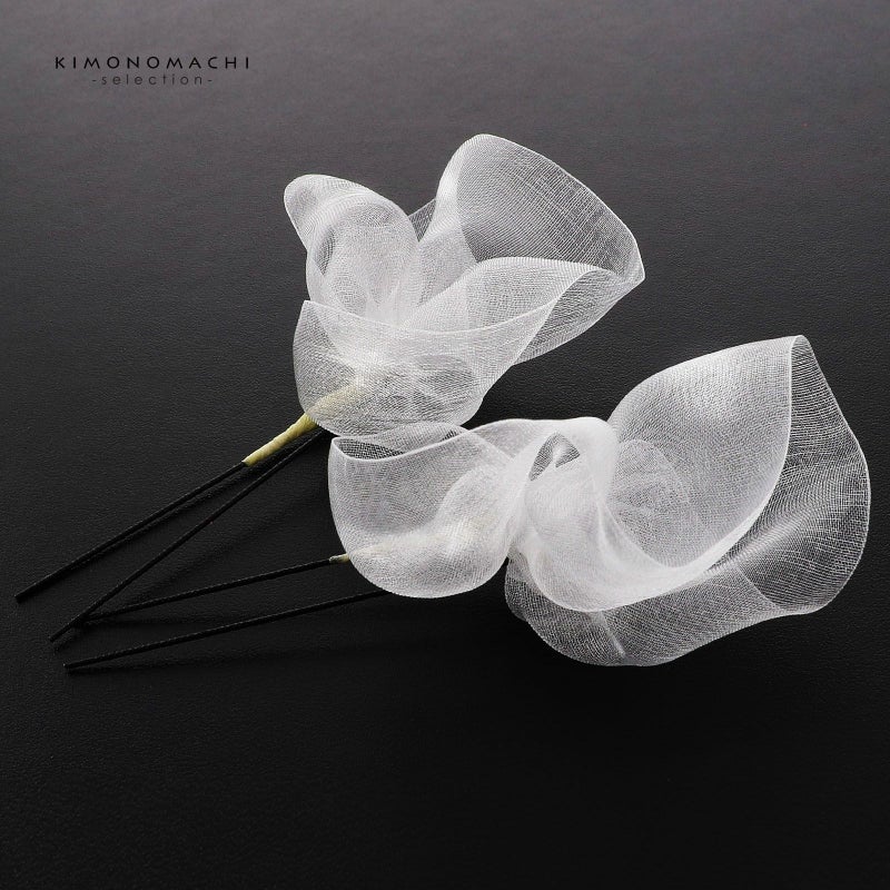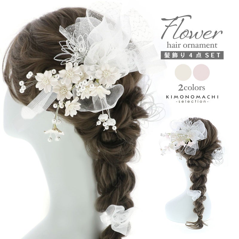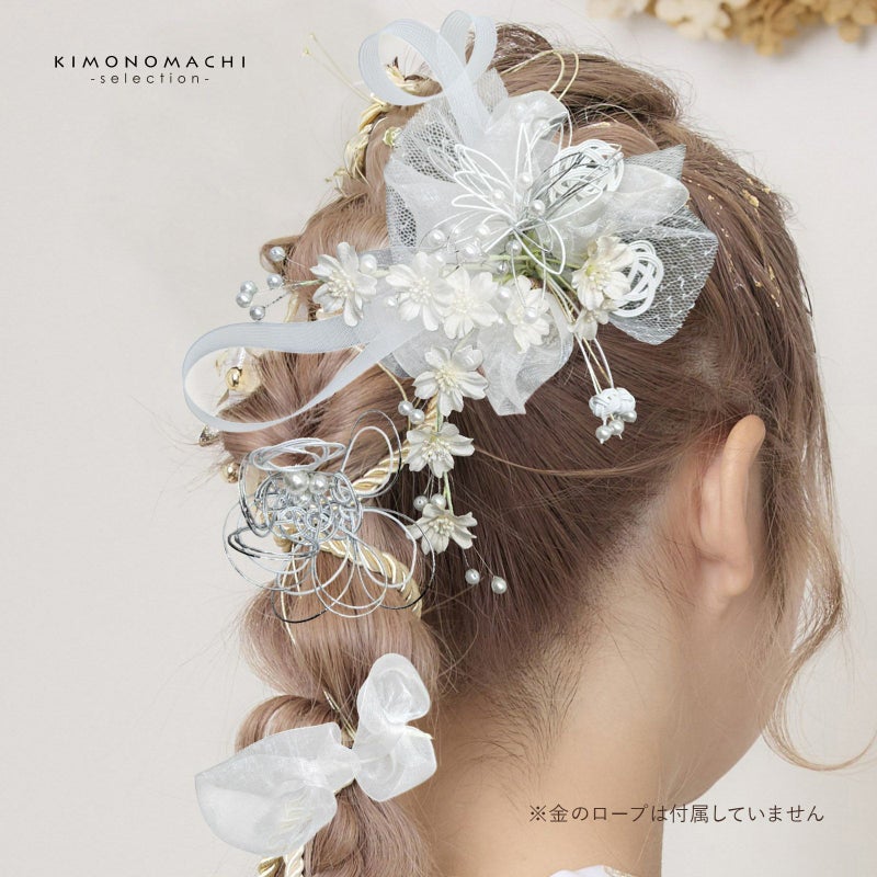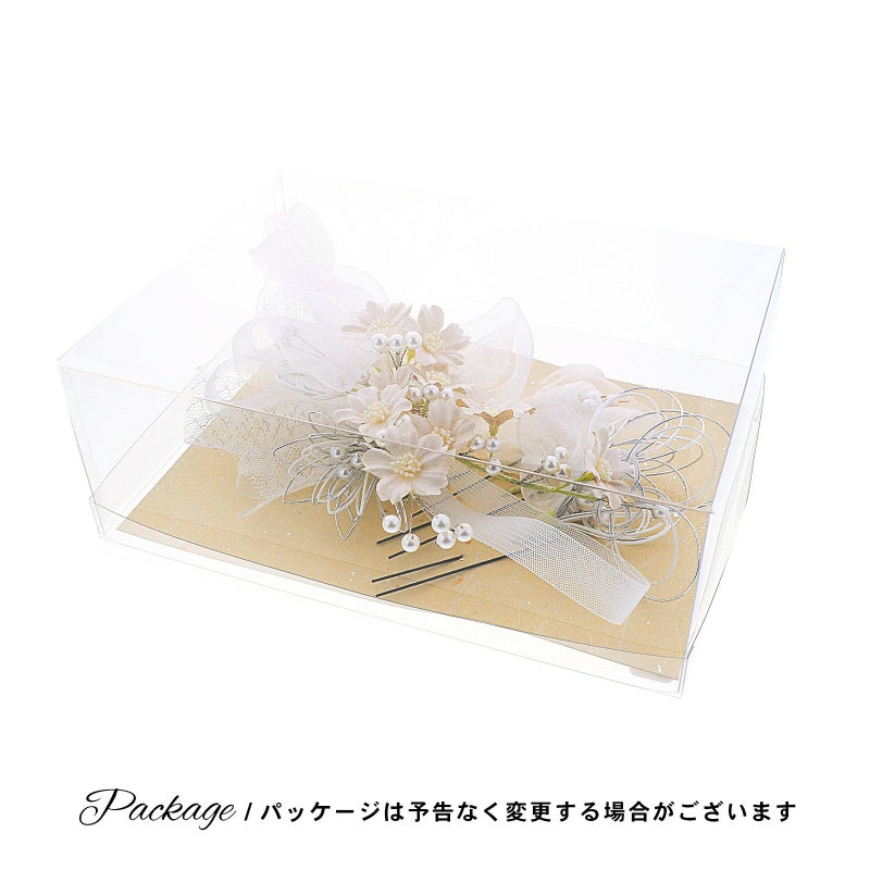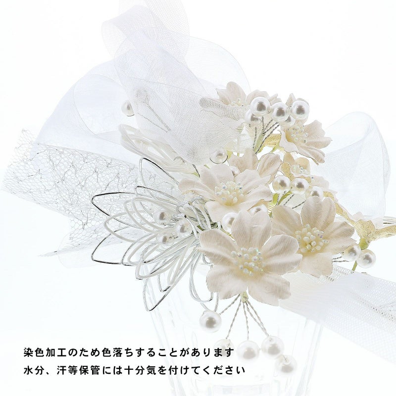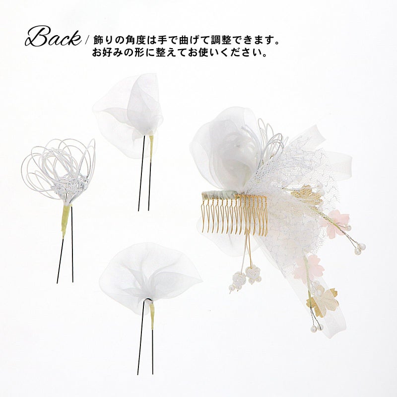 1.スノーホワイト リボンブーケ:表オフホワイトに裏ゴールド生地の桜の小花にパールや水引の蕾、白のカールしたチュールリボンやオーガンジーリボン、シルバーとホワイトの水引の百合の花を組み合わせたコーム1点。パールビーズの蕊に白と銀水引を結んだ花飾りUピン1点。白のオーガンジーリボン飾りのUピン2点。